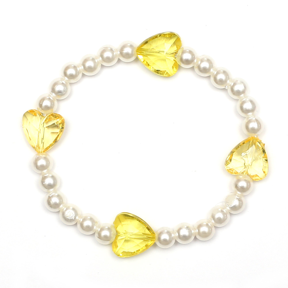 Dieses modische Kinderarmband wird von ihrer kleinen Prinzessin heiss begehrt werden. Die weissen Kunstperlen und die goldfarbenen, transparenten Herzen aus Acryl machen dieses Armband zu einem Blickfang.