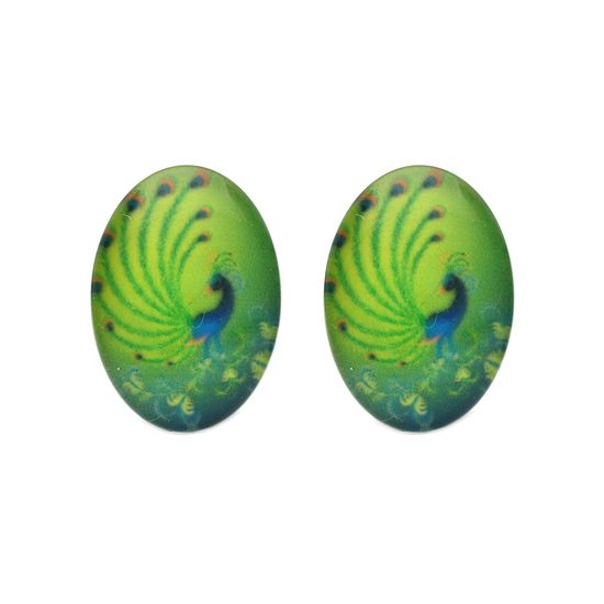Green Peacock Oval Shape Glass Print Clip on Earrings