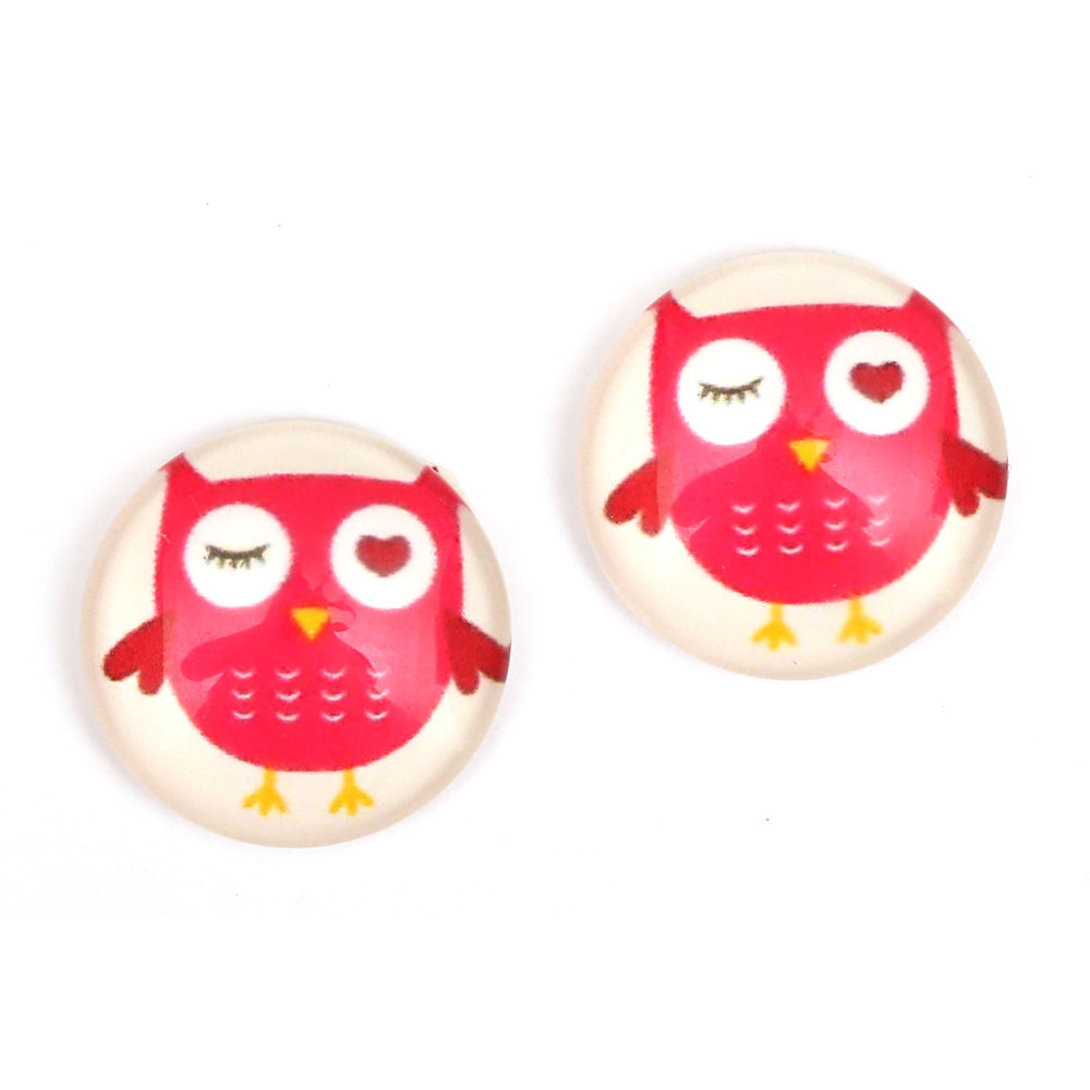 Pink owl on white glass button with gold-tone clips