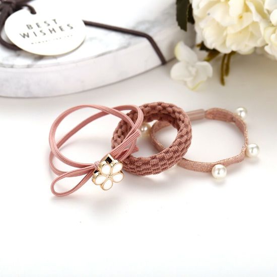 These lovely hair accessories include 3 pieces hair elastics in light brown colour decorated with flower and white round faux pearls. Perfect for kids, teen and women.