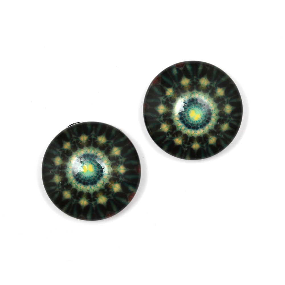 Green and black geometric flower printed glass round button clip-on earrings
